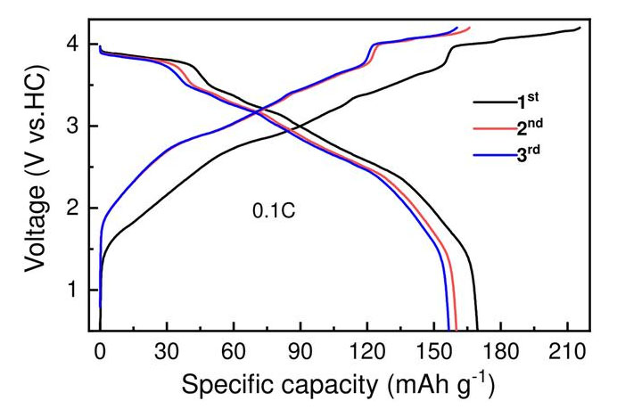 圖4. O3-NNFM正極和硬碳負極全電池在0.5-4.2 V電壓范圍內的前三周充放電曲線