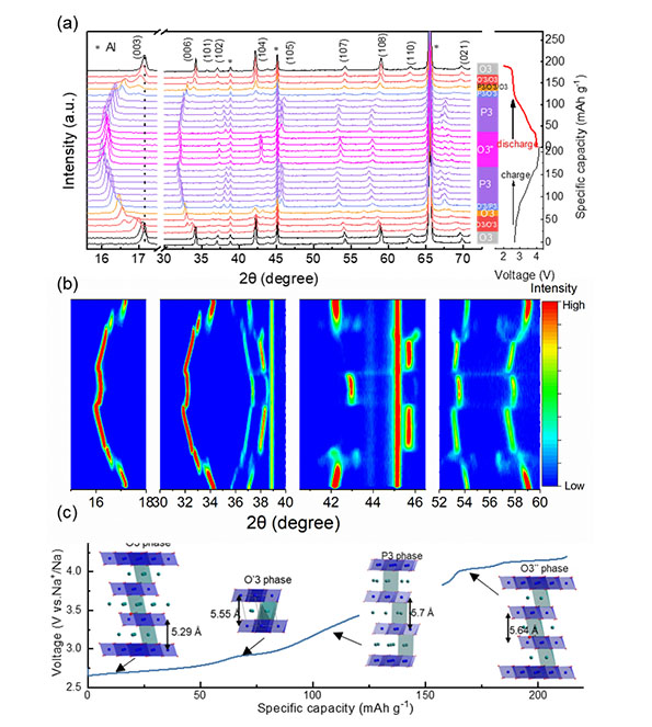 圖3. O3-NNFM材料(a,b)首圈充放電過程中的原位XRD圖譜和2D contour圖,(c)充電過程中的結構演化示意圖