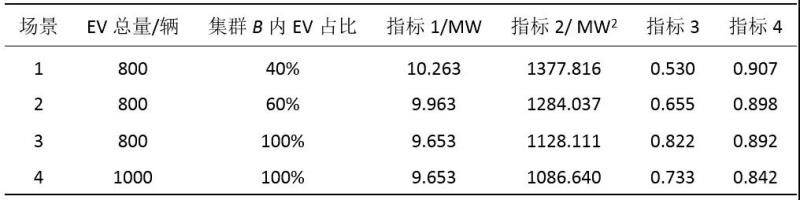 文章研究了不同場(chǎng)景下的電動(dòng)汽車有序充電引導(dǎo)控制效果,如表1所示,其中指標(biāo)1-4分別代表負(fù)荷峰谷差、負(fù)荷離差平方和、平均費(fèi)用滿意度和平均出行滿意度。