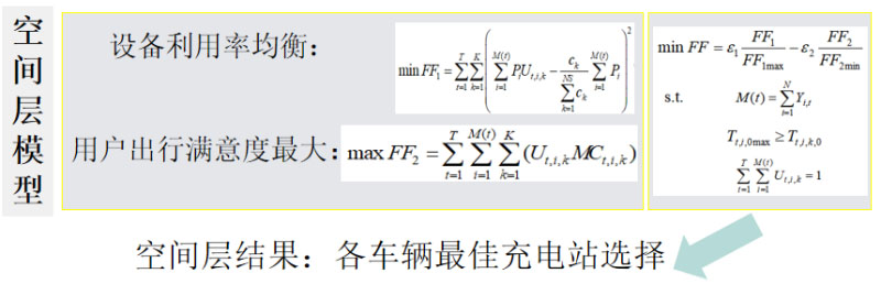 以時(shí)間層得到在各時(shí)間段開(kāi)始充電的電動(dòng)汽車數(shù)量作為約束條件,建立空間層實(shí)時(shí)優(yōu)化模型,進(jìn)行充電站選擇。在充電站角度,希望按充電站充電設(shè)備的規(guī)模來(lái)均勻分配車輛;在用戶角度,以用戶出行滿意度最大為目標(biāo)函數(shù)。因此建立的空間層優(yōu)化模型如圖6所示。