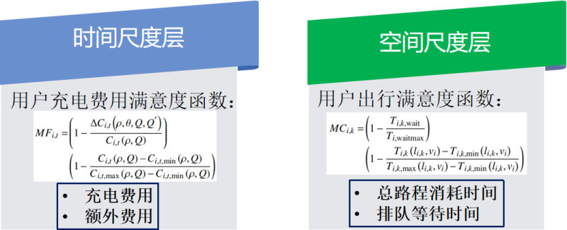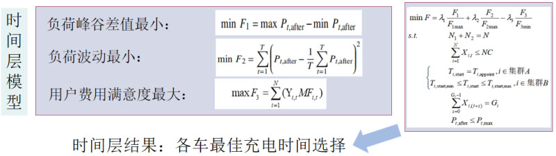 基于上述思想,建立時(shí)空雙尺度優(yōu)化模型。時(shí)間層優(yōu)化模型如圖5所示,將負(fù)荷曲線峰谷差最小和負(fù)荷波動(dòng)最小都列入目標(biāo)函數(shù)內(nèi)。同時(shí),將用戶充電費(fèi)用滿意度考慮在內(nèi),最大程度發(fā)揮用戶的參與度。