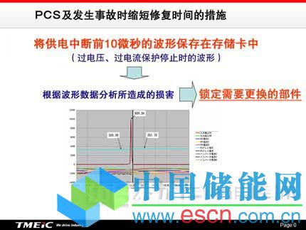 PCS配備了過電壓、過電流保護(hù)裝置,會(huì)斷開直流電路來防止雷擊導(dǎo)致事故擴(kuò)大,但重要的是,發(fā)生故障后如何盡快修復(fù),從而使發(fā)電損失降至最低。TMEIC通過將保護(hù)裝置啟動(dòng)10μs之前的電壓及電流波形保存在存儲(chǔ)卡內(nèi),來掌握入侵的浪涌能量,并在短時(shí)間內(nèi)鎖定發(fā)生故障的部件,由此縮短了修復(fù)時(shí)間(圖)。
