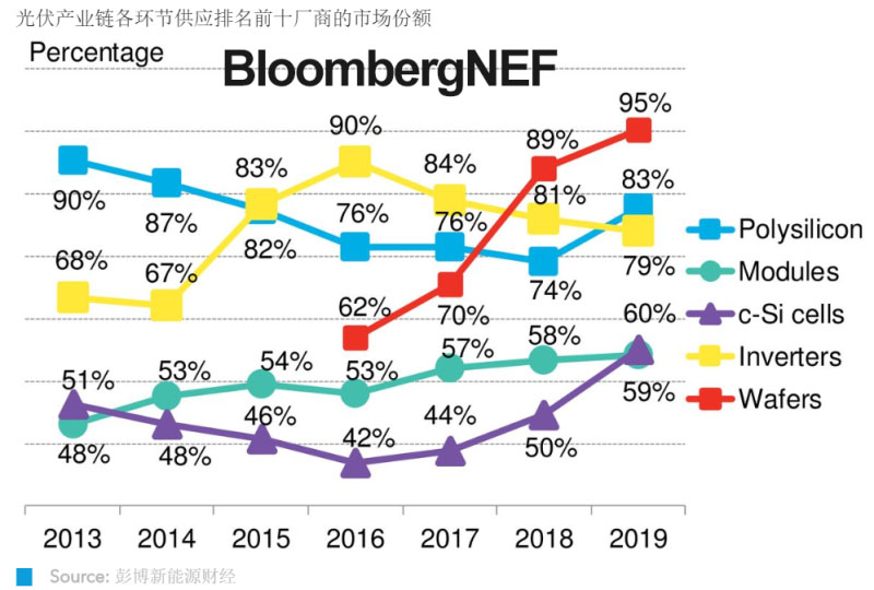 多晶硅和硅片環(huán)節(jié)持續(xù)整合。中國(guó)多晶硅廠商贏得更多市場(chǎng)份額,在全球產(chǎn)量占比從2018年的58%增至2019年66%。在硅片環(huán)節(jié),2019年前十家硅片廠商供應(yīng)了95%的全球市場(chǎng)。