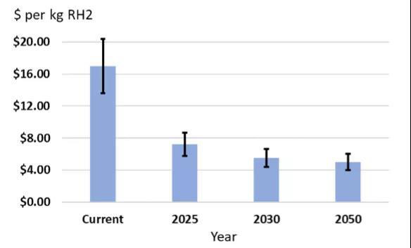 根據(jù)這項研究,“該分析預測工廠成本將從目前的每公斤約16美元(不包括補貼和信貸)下降到2025年的中位數(shù)估計值6美元,到2050年降至5美元以下,最終估計為每公斤4美元?!?