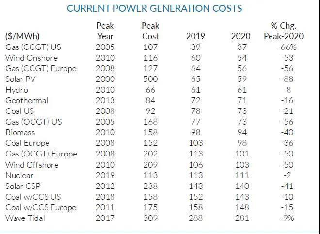 根據(jù)Energy Intelligence雜志匯總的數(shù)據(jù),2000年以后全球各類發(fā)電技術(shù)全生命周期的平準(zhǔn)化成本曾經(jīng)達(dá)到過的峰值(及年份)、2020年的最新成本以及2050年預(yù)測成本如下: