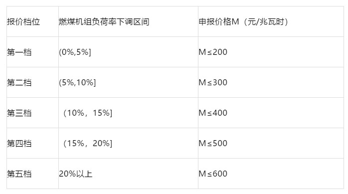 第18 參與深度調(diào)峰市場(chǎng)報(bào)價(jià)的燃煤機(jī)組在有償調(diào)峰基準(zhǔn)的基礎(chǔ)上,采用下調(diào)容量比率形式分檔報(bào)價(jià)。機(jī)組以5%容量作為一個(gè)報(bào)價(jià)檔位,由第一檔至第五檔按照價(jià)格遞增的原則逐段申報(bào)。機(jī)組可達(dá)到的最大下調(diào)能力須與報(bào)價(jià)信息同時(shí)申報(bào)。市場(chǎng)初期,對(duì)每檔申報(bào)價(jià)格設(shè)置價(jià)格上限,并根據(jù)市場(chǎng)運(yùn)行情況,必要時(shí)設(shè)置價(jià)格下限。