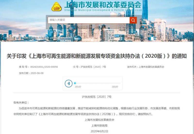 6月8日,上海市發(fā)展改革委、市財政局研究制訂的《上海市可再生能源和新能源發(fā)展專項資金扶持辦法(2020版)》(下簡稱《辦法》)對外發(fā)布,將對于企業(yè)投資的風(fēng)電、光伏項目,根據(jù)實際產(chǎn)生的電量對項目投資主體給予獎勵,獎勵時間為連續(xù)5年,單個項目年度獎勵金額不超過5000萬元。