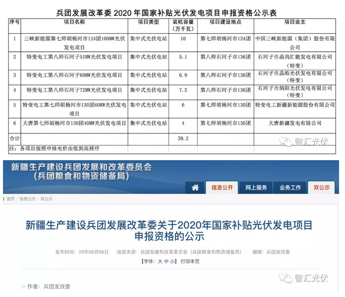 近日,新疆建設(shè)兵團(tuán)發(fā)展改革委發(fā)布了《2020年國家補(bǔ)貼光伏發(fā)電項(xiàng)目申報(bào)資格公示表》,共39.2萬kW,根據(jù)公示項(xiàng)目: