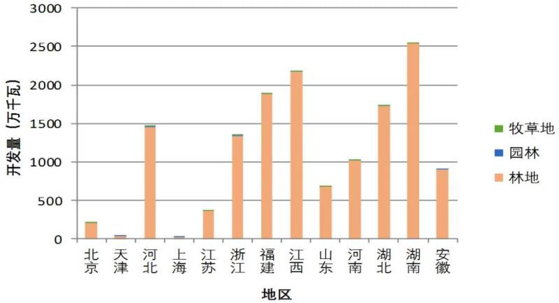 在土地利用率方面,分散式風電在林地、園地、牧草地的平均利用率分別為3%、0.1%、0.5%。針對風電開發(fā)利用形式不同,不同區(qū)域可用于分散式風電開發(fā)的土地利用率具有一定的差異性。對于西北部地區(qū),以集中式電站開發(fā)為主,分散式風電土地利用率低,林地、園地、牧草地利用率取1%、0.03%、0.17%。對于東中部地區(qū),以分散式風電開發(fā)為主,分散式風電土地利用率高,林地、園地、牧草地利用率取9%、0.3%、1.5%。其他區(qū)域林地、園地、牧草地利用率取平均值3%、0.1%、0.5%。