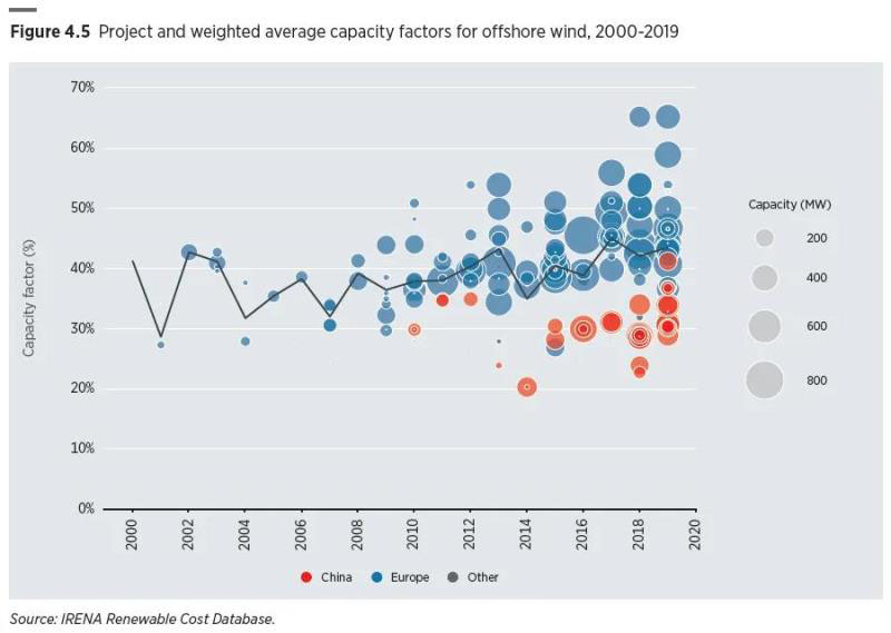 圖4.5 2000-2019年海上風(fēng)電的項(xiàng)目和加權(quán)平均容量系數(shù)