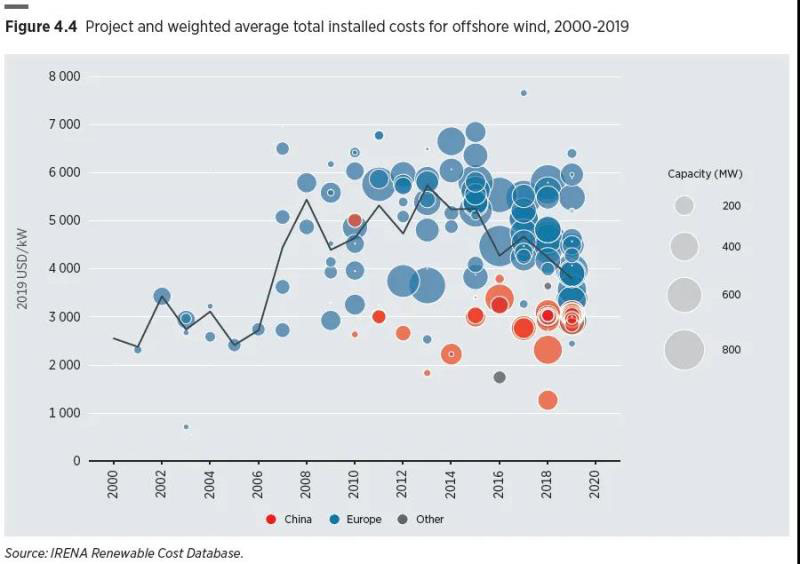 圖4.4 2000-2019年海上風(fēng)電的項(xiàng)目和加權(quán)平均總安裝成本