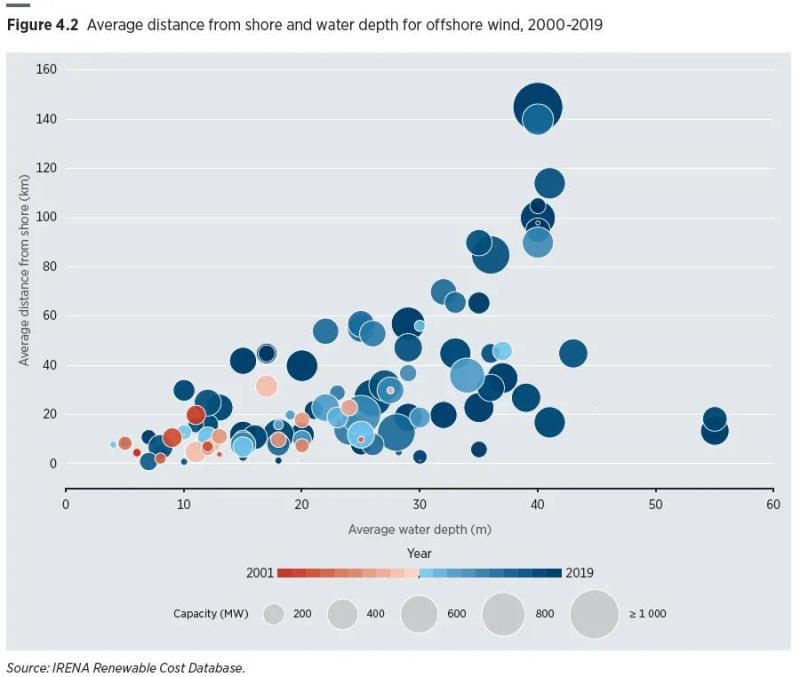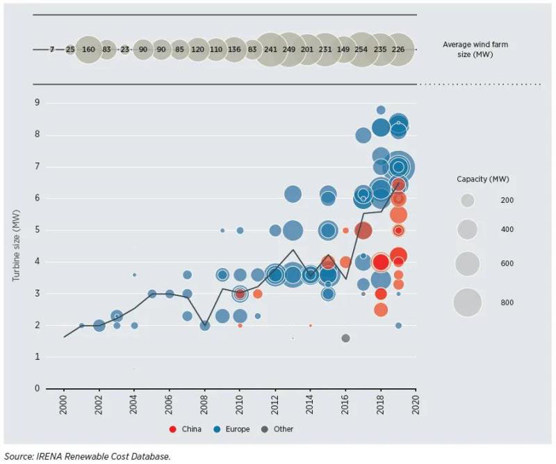 圖4.3 2000-2019年項(xiàng)目風(fēng)機(jī)尺寸以及全球加權(quán)平均風(fēng)機(jī)尺寸和海上風(fēng)電場(chǎng)容量的關(guān)系和變化情況