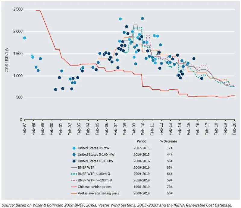 近十年來,陸上和海上風(fēng)電成本分別下降了 40% 和 29%,在 2019 年分別降至 0.053 美元/千瓦時(shí)和 0.115美元/千瓦時(shí)。自 2010 年以來,陸上風(fēng)電機(jī)組的價(jià)格下降了 55-60%,從而降低了裝機(jī)成本,而在運(yùn)營(yíng)與維護(hù)成本下降的同時(shí),不斷增大的輪轂高度和掃風(fēng)面積也增大了容量系數(shù)。