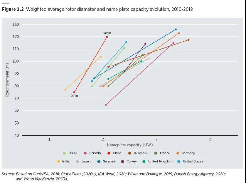 圖2.2 2010-2018年加權(quán)平均風(fēng)輪直徑和銘牌容量的變化