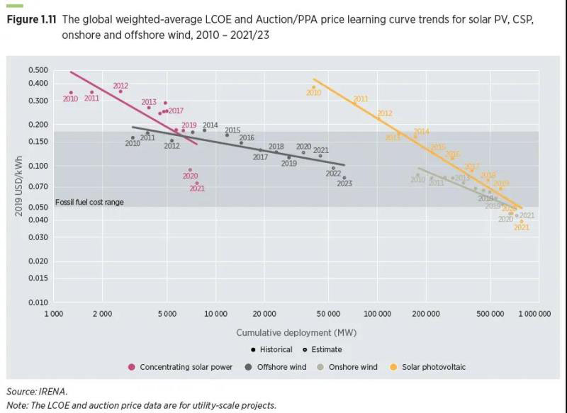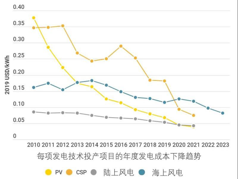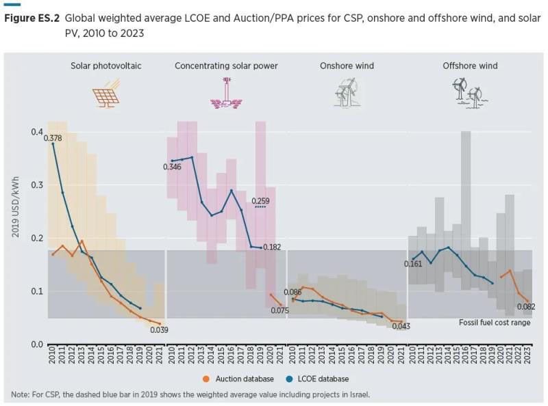 圖ES.2 2010年至2023年太陽能光伏、聚光太陽能、陸上風(fēng)電和海上風(fēng)能的全球加權(quán)平均LCOE和拍賣/PPA價(jià)格