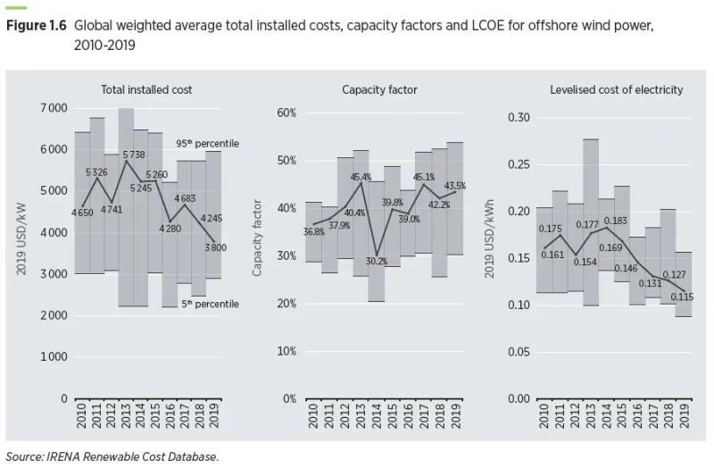圖1.6 2010-2019年海上風(fēng)電的全球加權(quán)平均總安裝成本、容量系數(shù)和LCOE成本變化趨勢(shì)