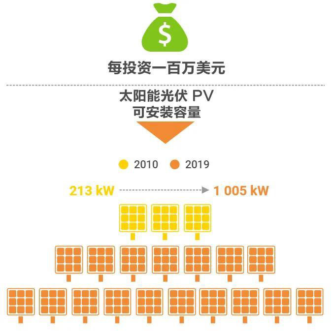 可再生能源發(fā)電成本持續(xù)下降,同樣投資可帶來更多可再生能源裝機(jī)