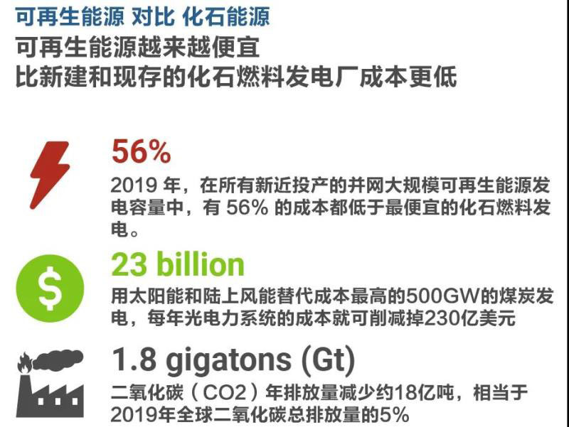 2021年,用太陽能和陸上風(fēng)能替代成本最高的5億千瓦的煤炭發(fā)電,每年光電力系統(tǒng)的成本就可削減掉230億美元,二氧化碳(CO2)年排放量減少約18億噸,相當(dāng)于2019年全球二氧化碳總排放量的5% ,而且,還將產(chǎn)生9400億美元的投資刺激,約占全球GDP的1%。