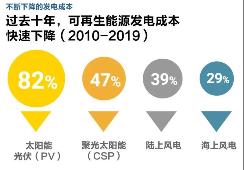 國(guó)際可再生能源署(IRENA)發(fā)布的年度報(bào)告顯示,2019 年,在所有新近投產(chǎn)的并網(wǎng)大規(guī)模可再生能源發(fā)電容量中,有 56% 的成本都低于最便宜的化石燃料發(fā)電。