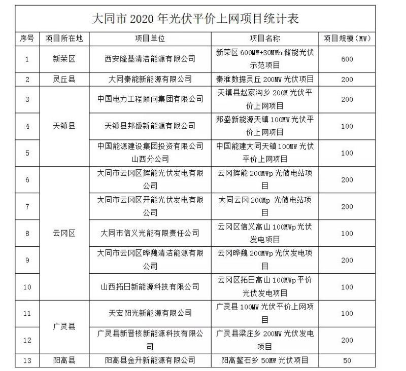2020年6月8日,大同市能源局公示2020年光伏平價上網(wǎng)優(yōu)選項目,根據(jù)公告,截止6月7日18:00時,共有以下13家企業(yè)申報,共計容量2.35GW。