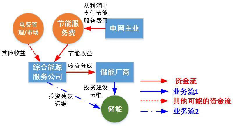 競(jìng)爭性業(yè)務(wù)模式適用于提供調(diào)頻等輔助服務(wù)、移峰填谷和提高新能源利用水平三類場(chǎng)景的電網(wǎng)側(cè)儲(chǔ)能應(yīng)用,按照投資回收方式不同,該商業(yè)模式又可細(xì)分為合同能源管理模式、兩部制電價(jià)模式、輔助服務(wù)市場(chǎng)模式、現(xiàn)貨交易市場(chǎng)模式和綜合模式。競(jìng)爭性業(yè)務(wù)模式由可參與市場(chǎng)競(jìng)爭的社會(huì)資本投資,業(yè)務(wù)受輸配電價(jià)監(jiān)管的電網(wǎng)主業(yè)不允許投資。各商業(yè)模式的關(guān)系示意圖如圖2~圖6所示。