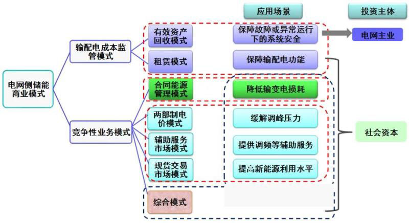 我國電網(wǎng)側(cè)儲(chǔ)能尚缺乏成熟的商業(yè)模式,結(jié)合中國政策要求和電力體制改革情況,考慮投資主體、投資回收機(jī)制、業(yè)務(wù)監(jiān)管機(jī)制等因素,電網(wǎng)側(cè)儲(chǔ)能的潛在商業(yè)模式可分為輸配電成本監(jiān)管模式和競(jìng)爭性業(yè)務(wù)模式兩大類。輸配電成本監(jiān)管模式適用于保障故障或異常運(yùn)行下的系統(tǒng)安全和保障輸配電功能兩類場(chǎng)景的電網(wǎng)側(cè)儲(chǔ)能應(yīng)用,按照投資回收方式不同,該商業(yè)模式又可細(xì)分為有效資產(chǎn)回收模式和租賃模式。有效資產(chǎn)回收模式由于資產(chǎn)要進(jìn)入輸配電價(jià)核算,因此只能由業(yè)務(wù)受到監(jiān)管的電網(wǎng)主業(yè)投資;租賃模式可由社會(huì)資本投資,但租賃費(fèi)用由價(jià)格主管部門負(fù)責(zé)核定和監(jiān)管。