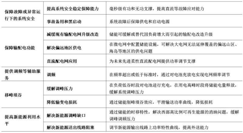 為更好利用電網(wǎng)側(cè)儲(chǔ)能,有必要將其應(yīng)用場(chǎng)景進(jìn)行細(xì)分,分為5大類,分別為保障故障和異常運(yùn)行下的系統(tǒng)安全、保障輸配電功能、提供調(diào)頻等輔助服務(wù)、移峰填谷和提高新能源利用水平,如表1所示。