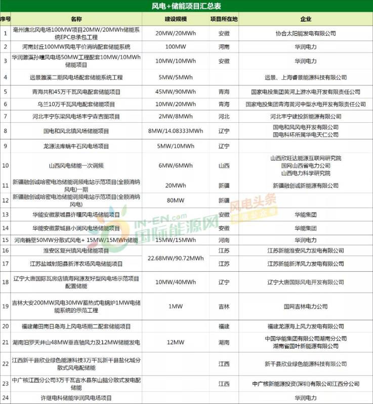 表中省份除了對(duì)新建的風(fēng)電項(xiàng)目要求配置儲(chǔ)能設(shè)備之外,山西省對(duì)35KV以上的光伏電站(已建好)要求進(jìn)行一次調(diào)峰改造,更被視為風(fēng)光儲(chǔ)配置擴(kuò)大化的表現(xiàn)。同時(shí),國(guó)際能源網(wǎng)/風(fēng)電頭條(微信號(hào):wind-2005s)還對(duì)目前已經(jīng)見諸報(bào)端的風(fēng)電+儲(chǔ)能項(xiàng)目進(jìn)行了簡(jiǎn)單的統(tǒng)計(jì)。