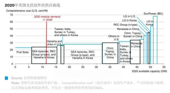 BNEF預(yù)計(jì)2020年可供應(yīng)美國(guó)市場(chǎng)的雙面組件產(chǎn)能將達(dá)到20.5GW,其中9.4GW的雙面組件平均生產(chǎn)成本為22美分/瓦。大型廠商今年下半年可將組件生產(chǎn)成本壓低至18美分/瓦。由于普遍性供過于求,在豁免關(guān)稅的情況下,雙面組件價(jià)格有可能降至23美分/瓦,這個(gè)價(jià)格在涵蓋所有非生產(chǎn)性支出的情況下,可保證4%的凈利潤(rùn)率。