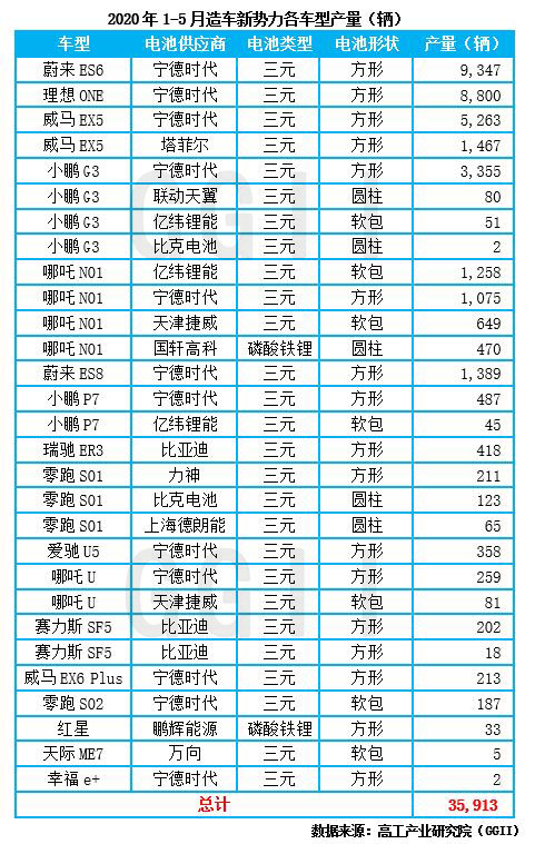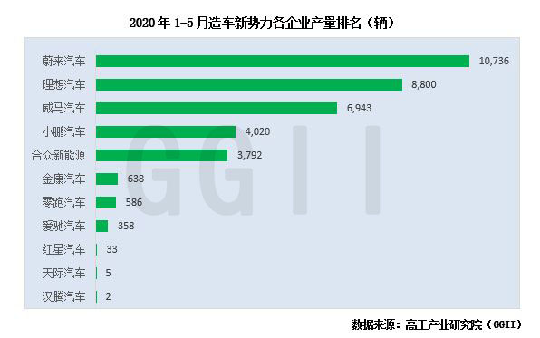 隨著具有很強(qiáng)競(jìng)爭(zhēng)力的理想ONE在2020年開始量產(chǎn)交付,2020年1-5月理想汽車產(chǎn)量超過威馬,形成蔚來、理想、威馬產(chǎn)量排名前三格局。在造車新勢(shì)力中,金康汽車與去年同期相比產(chǎn)量增速最大,高達(dá)158倍,主要由于賽力斯SF5量產(chǎn)所致。