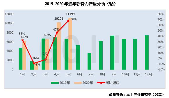 高工產(chǎn)業(yè)研究院(GGII)通過發(fā)布的《新能源汽車產(chǎn)業(yè)鏈數(shù)據(jù)庫》統(tǒng)計(jì)顯示,2020年1-5月造車新勢(shì)力共計(jì)生產(chǎn)新能源汽車約3.6萬輛,同比增長(zhǎng)34%。其中,5月份生產(chǎn)11,199輛,同比增長(zhǎng)68%。2-3月受疫情影響,產(chǎn)量同比增速為負(fù),4月份起開始逐步攀升。