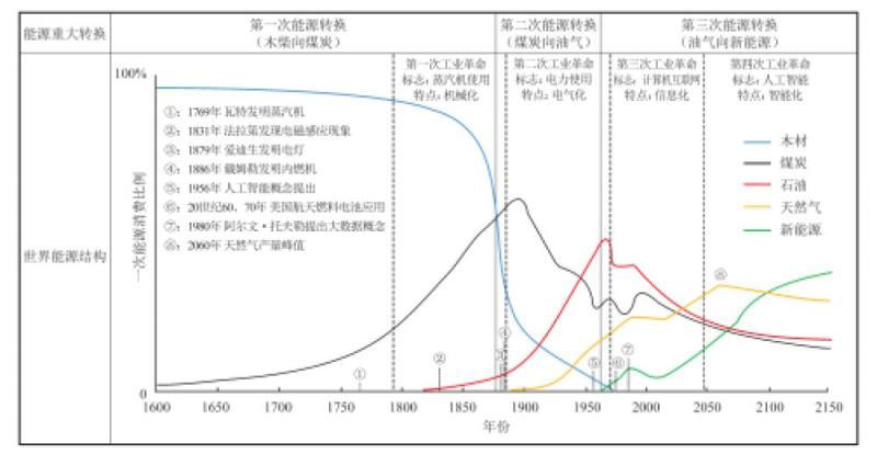 人類社會已經(jīng)歷了三次工業(yè)革命(圖 2),從 20 世紀(jì)中葉起,伴隨著第四次工業(yè)革命全球向新能源轉(zhuǎn)型已經(jīng)開始(圖 3)??v觀能源發(fā)展史,三大能源升級換代體現(xiàn)了“三大經(jīng)濟”形態(tài)。瓦特發(fā)明蒸汽機促使木柴向煤炭的第一次重大轉(zhuǎn)換,表現(xiàn)為“高碳經(jīng)濟”;戴姆勒發(fā)明內(nèi)燃機,完成煤炭向油氣的第二次 重大轉(zhuǎn)換,呈現(xiàn)出“低碳經(jīng)濟”;現(xiàn)代科技進步與當(dāng) 今環(huán)保要求推動傳統(tǒng)化石能源向氫能等非化石新能 源的第三次重大轉(zhuǎn)換,全球可能逐步邁入非碳的“氫能時代”[3-4]。