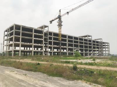 紅星新能源汽車生產(chǎn)基地的廠房外圍荒草叢生,其中一座廠房?jī)H完成主體框架建設(shè)。陳茂利/攝影