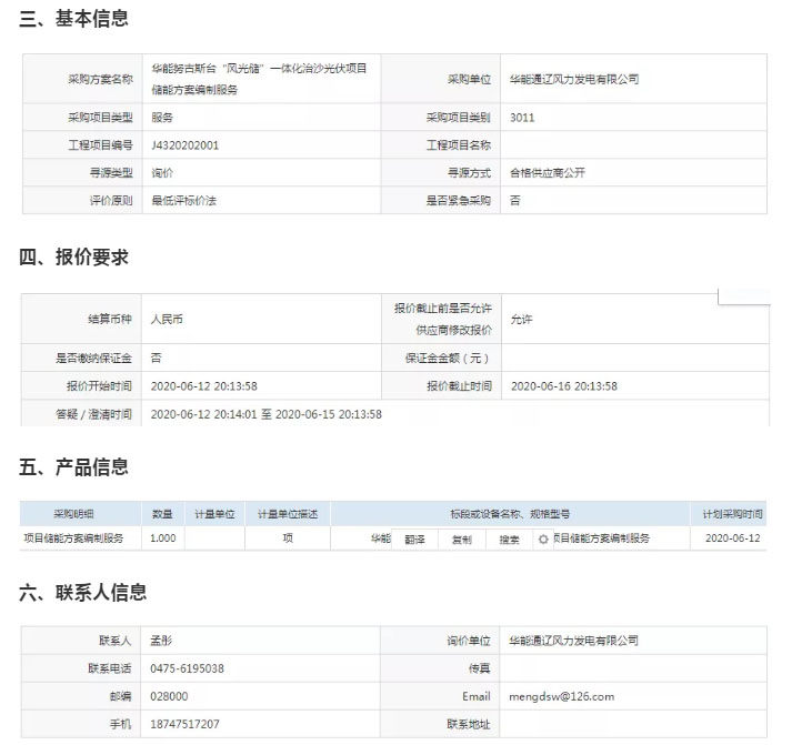 2020年06月12日華能通遼風(fēng)力發(fā)電有限公司華能努古斯臺(tái)“風(fēng)光儲(chǔ)”一體化治沙光伏項(xiàng)目儲(chǔ)能方案編制服務(wù)詢價(jià)書詢價(jià)公告