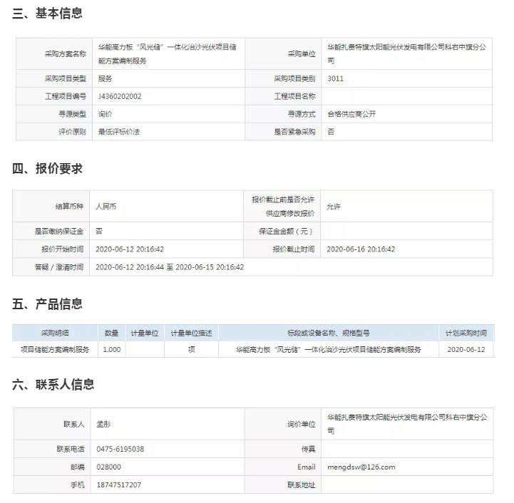 2020年06月12日華能扎賚特旗太陽能光伏發(fā)電有限公司科右中旗分公司華能高力板“風(fēng)光儲(chǔ)”一體化治沙光伏項(xiàng)目儲(chǔ)能方案編制服務(wù)詢價(jià)書詢價(jià)公告