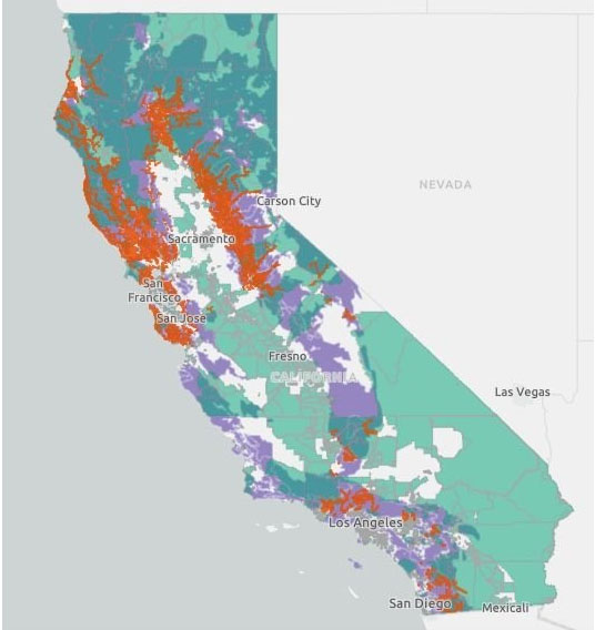 這張地圖顯示了加利福尼亞州符合自發(fā)電激勵(lì)計(jì)劃(SGIP)激勵(lì)類別的部分地區(qū),紫色為高火災(zāi)威脅區(qū),橙色為去年兩次或兩次以上停電的地區(qū),淺綠色為低收入和弱勢(shì)人口的所在地區(qū),以及高火災(zāi)威脅區(qū)和弱勢(shì)群體社區(qū)重疊的區(qū)域(深綠色)