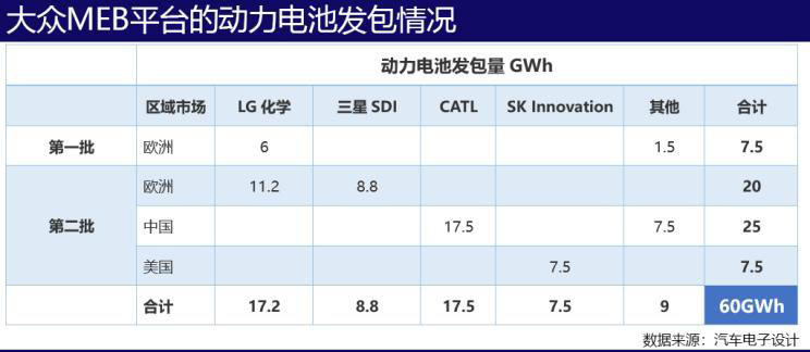 以大眾為例,其MEB平臺已分四批鎖定了不同的電池供應(yīng)商,前兩批采購量是60GWh,供應(yīng)商是清一色的亞洲供應(yīng)商,寧德時代拿到了最大的單子。