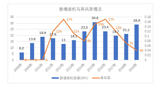 如果結(jié)合裝機量和棄風率可以發(fā)現(xiàn),風電裝機在棄風率減少時便會出現(xiàn)增長。究其原因,主要就是消納問題。