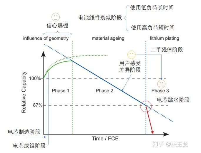 還有一個(gè)重要點(diǎn):動(dòng)力電池的壽命限制在哪里?從技術(shù)的角度來說,我們正常在使用電芯中往往會(huì)觀察到三個(gè)階段: