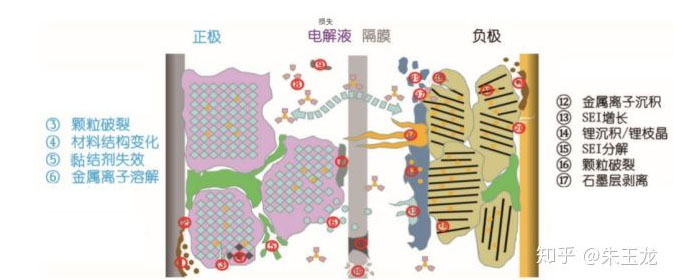 正極材料,在循環(huán)過程中會(huì)有不可逆的相變,還有金屬離子溶出;正極材料顆粒破碎,粘結(jié)劑分解和正極材料晶體結(jié)構(gòu)改變等因素,會(huì)導(dǎo)致一部分正極活性物質(zhì)失去嵌鋰等能力;負(fù)極材料中會(huì)有活性物質(zhì)脫落,粘結(jié)劑分解等因素,都會(huì)導(dǎo)致部分負(fù)極活性物質(zhì)顆粒失去與導(dǎo)電網(wǎng)絡(luò)的導(dǎo)電連接,從而使其無法嵌鋰,造成鋰離子電池容量損失。
