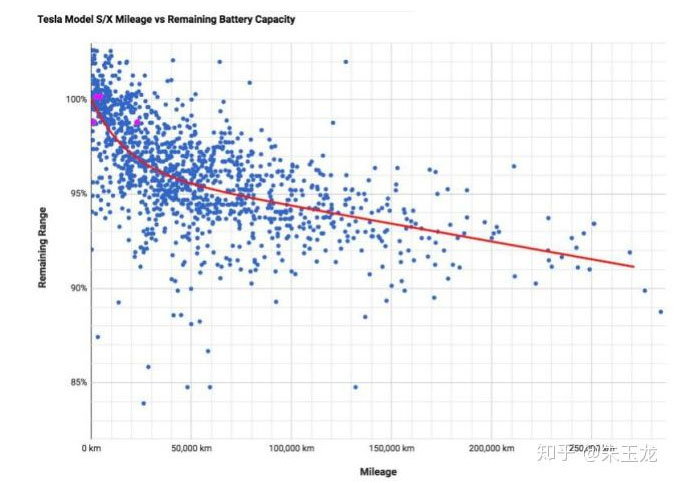 實(shí)際上,動(dòng)力電池在和電動(dòng)汽車設(shè)計(jì)中,容量衰減預(yù)測(cè)和分析,是非常重要的。工程師們通過考慮不同的影響因子,包括環(huán)境溫度、不同使用電池放電深度和使用工況構(gòu)建數(shù)學(xué)模型,對(duì)整個(gè)電池的可用性要做出大量的驗(yàn)證工作。如下圖所示,實(shí)際上電池的衰減也是呈現(xiàn)出一定的離散型,在16萬公里質(zhì)保期內(nèi)努力設(shè)計(jì)成不會(huì)快速跳變的狀態(tài)。