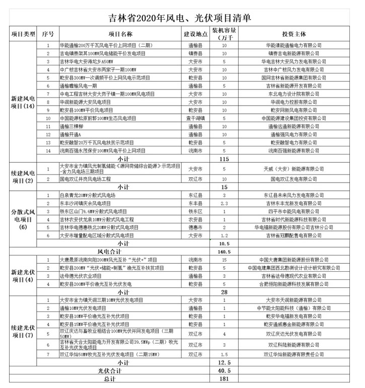 6月15日,吉林省能源局印發(fā)《關(guān)于下達(dá)2020年度風(fēng)電、光伏發(fā)電項(xiàng)目建設(shè)計(jì)劃的通知》,根據(jù)文件,確定本年度新增風(fēng)電、光伏項(xiàng)目建設(shè)規(guī)模為181萬千瓦,其中集中式風(fēng)電項(xiàng)目115萬千瓦,續(xù)建風(fēng)電項(xiàng)目15萬千瓦,分散式風(fēng)電項(xiàng)目10.5萬千瓦,集中式光伏項(xiàng)目28萬千瓦,續(xù)建光伏項(xiàng)目12.5萬千瓦。