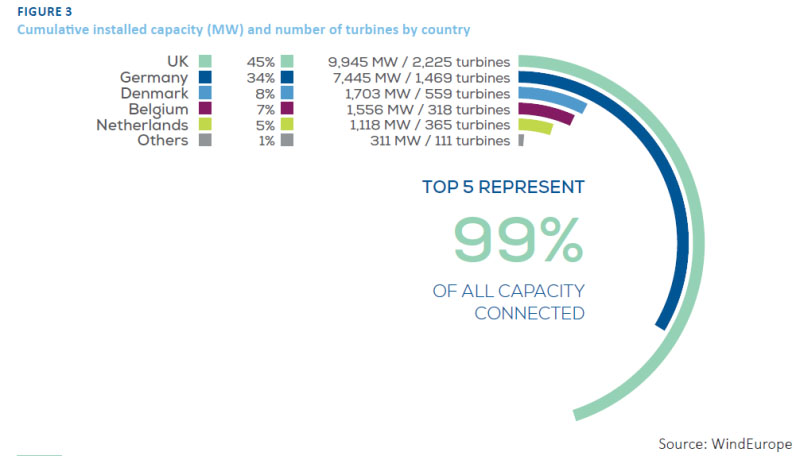 根據(jù)歐洲風電協(xié)會發(fā)布的2019歐洲海上風電報告,目前挪威已并網(wǎng)的海上風電只有1臺風機,總共2.3MW。在歐洲安裝有海上風電的國家排名中,挪威和法國處于最末2位。歐洲海上風電領先的5個國家中,英國海上風電總裝機接近10GW,德國超過7.4GW,隨后的丹麥、比利時與荷蘭分別為1.7GW、1.56GW和1.12GW,占到了全歐洲海上風電安裝總量的99%。