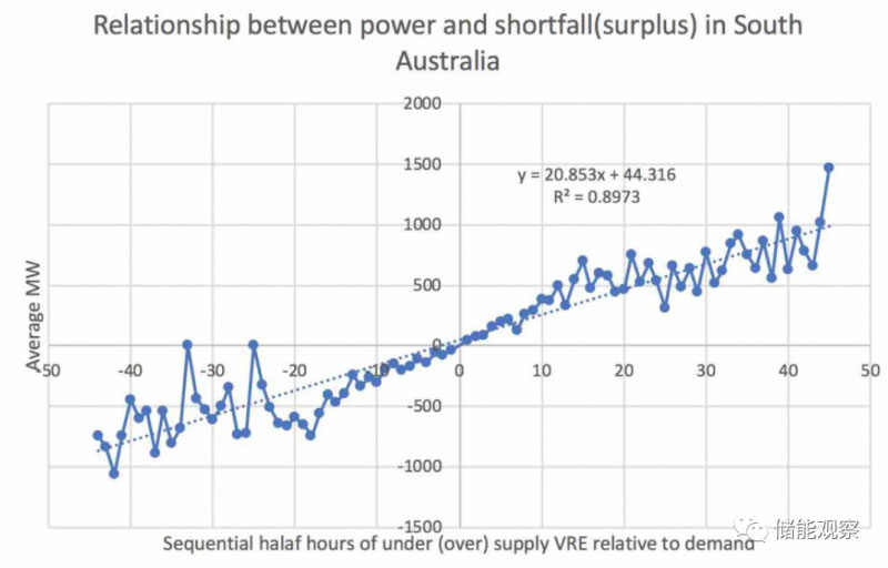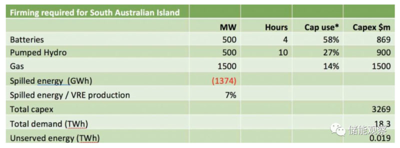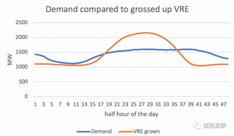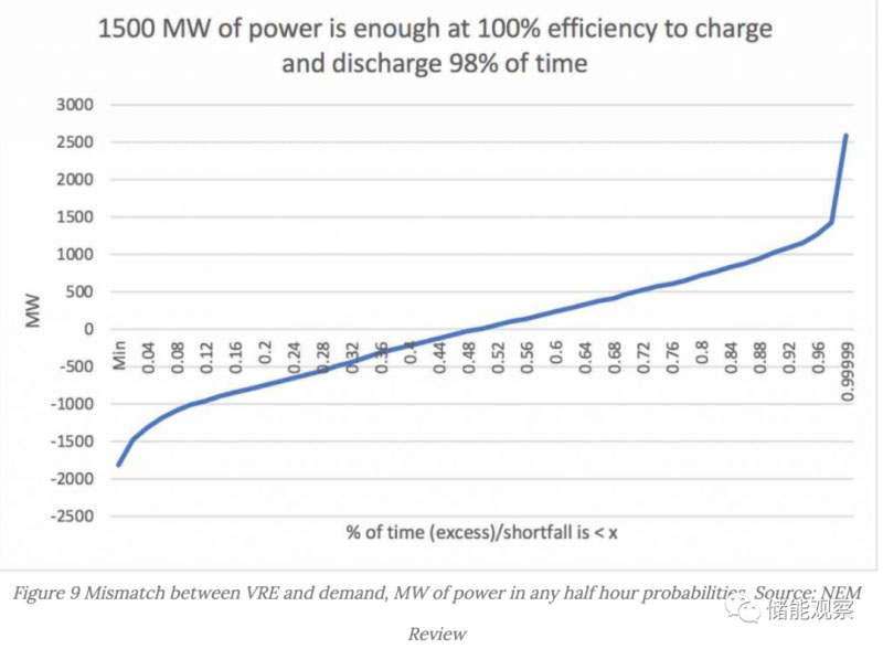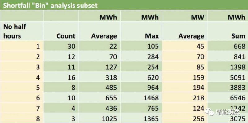 說的再清楚一些,圖表顯示,樣本期內(nèi),需求量超過VRE產(chǎn)能的、連續(xù)兩個半個小時的次數(shù)為12次。最后一欄顯示,所有這兩個半個小時間隔的累計不足量為841MWh,平均不足量為70MWh。