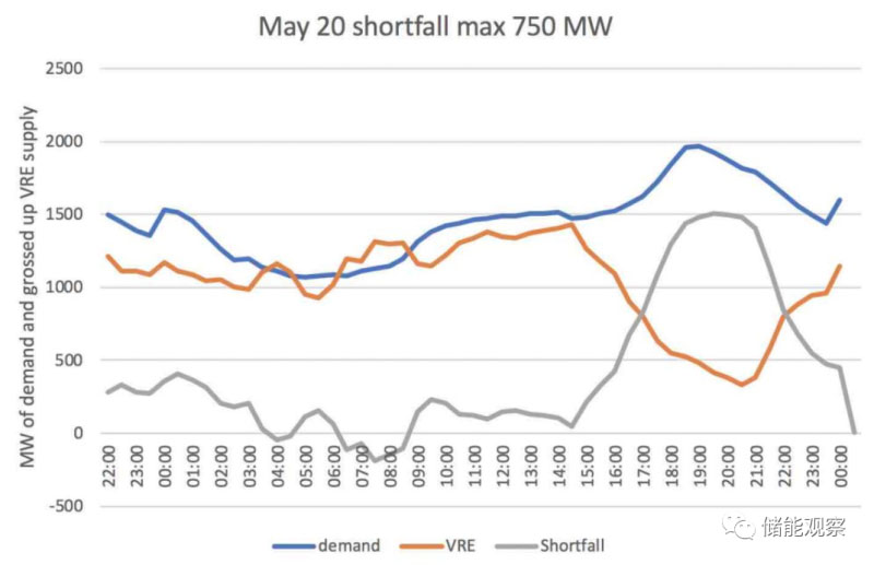 舉例來說,正好有四輪33個半個小時、需求持續(xù)超過供應(yīng)的運行時段。其中一次是在2020年5月,這一時段的平均差額為313MW。