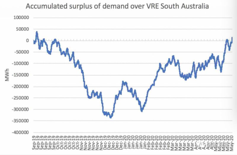 在圖中,負(fù)數(shù)代表VRE超出需求的累計過剩量。圖中顯示,過剩量在九月份的季度里累積,在夏季逐漸耗盡,最后變成正數(shù)。VRE產(chǎn)出量設(shè)計為等同于該期間的總需求量。