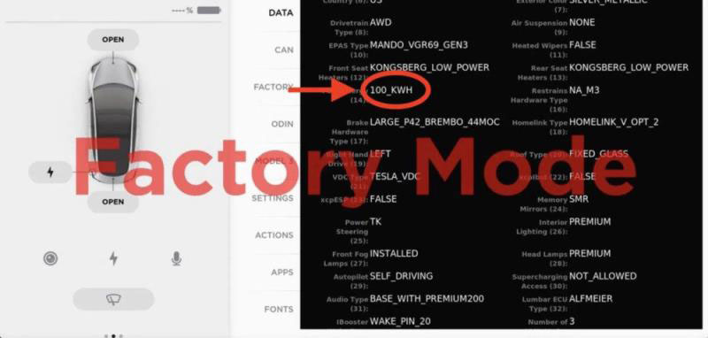 日前,另一名黑客“Zeus M3”在Twitter上表示,其進入了特斯拉的工廠模式(Factory Mode),并且發(fā)現了100 kWh電池容量版本的Model 3。他還在Twitter上發(fā)布了這個工廠模式的截圖: