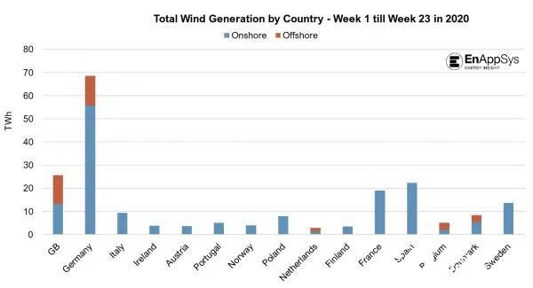 EnAppSys發(fā)布的數(shù)據(jù)顯示,英國(guó)超過(guò)西班牙成為歐洲第二大風(fēng)電產(chǎn)出國(guó)。數(shù)據(jù)考察了2020年前23周(1-5月)的歐洲風(fēng)電水平,發(fā)現(xiàn)英國(guó)在此期間僅次于德國(guó)排名第二。