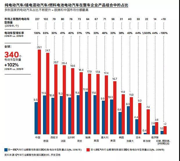 相較第六期報(bào)告,純電動(dòng)汽車與插電混動(dòng)汽車銷售增速有所放緩。接受調(diào)研的18個(gè)國家在2019年和2018年的銷量分別為210萬輛和190萬臺(tái),年增長率為10.5%。相比之下,盡管全球汽車銷量停滯不前,但為實(shí)現(xiàn)降低碳排放的目標(biāo),電動(dòng)汽車銷量仍需實(shí)現(xiàn)兩位數(shù)的年增長率。目前超過340款純電動(dòng)和插電混動(dòng)車型已在《汽車行業(yè)顛覆性數(shù)據(jù)探測》報(bào)告中的18個(gè)國家銷售,相比2016年第一期報(bào)告中的125款車型有著大幅增加。