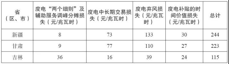 根據(jù)三省區(qū)的風(fēng)電運(yùn)行情況可以計(jì)算得出新疆的棄風(fēng)總損失為47.67億元,位居第一,甘肅為25.38億元,吉林為4.08億元。電力中長(zhǎng)期交易的損失遠(yuǎn)低于棄風(fēng)損失。新疆的電力中長(zhǎng)期交易損失為26.37億,甘肅為19.6億,吉林為1.64億元。其中,甘肅跨省跨區(qū)交易產(chǎn)生的價(jià)差損失就達(dá)到13.54億元。本文所計(jì)算的已知可再生能源拖欠的補(bǔ)貼是從第五批開始的,經(jīng)計(jì)算,新疆拖欠的度電補(bǔ)貼時(shí)間價(jià)值為0.03元/千瓦時(shí),甘肅為0.027元/千瓦時(shí),吉林為0.024元/千瓦時(shí) ,如果拖欠的時(shí)間更久對(duì)于可再生能源企業(yè)來(lái)說就是更大的損失。